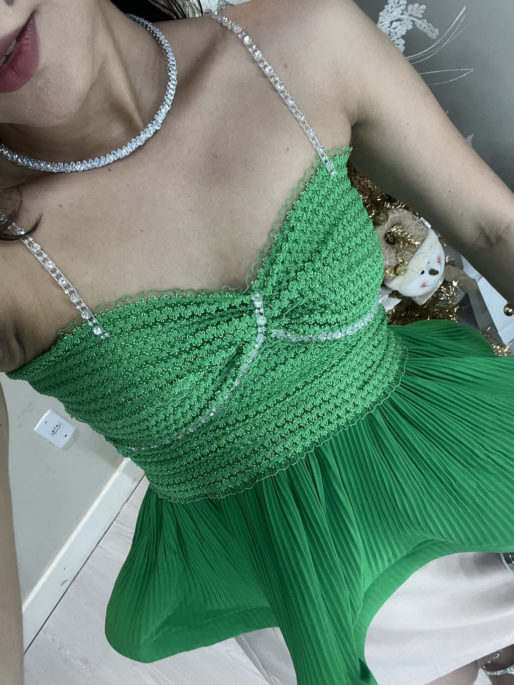 Com alças adornadas com fio de strass, fecho em zíper nas costas, tecido plissado e um charmoso detalhe peplum, esta blusa é um verdadeiro símbolo de elegância refinada.
